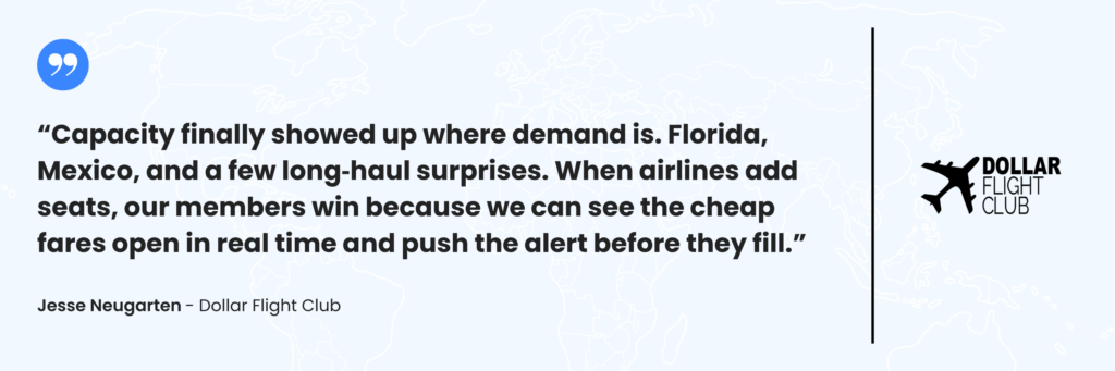 - Capacity + competition are finally where demand is. Florida and Mexico are the big winners; select transatlantic pairs added winter seats.