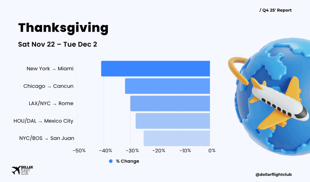 What you’ll find here: The sharpest, most bookable declines we’re seeing inside the Thanksgiving and Christmas/New Year windows. We highlight the route, what’s pushing prices down (capacity, competition, shoulder overlap), and the small move that unlocks it.