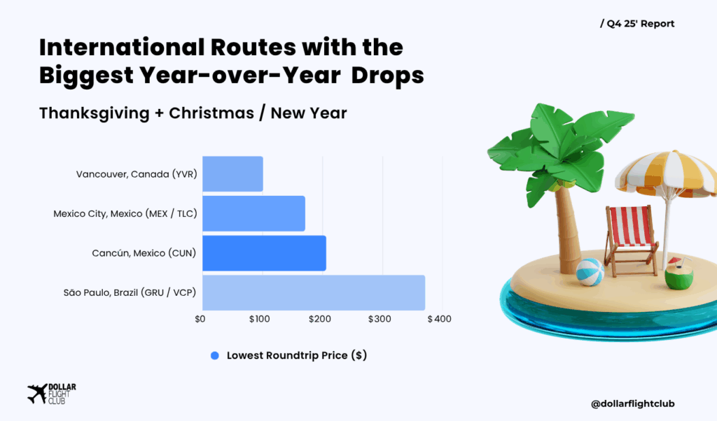 - As low as: $206 roundtrip (Dallas–Fort Worth → Cancún) ~29% lower vs last year.