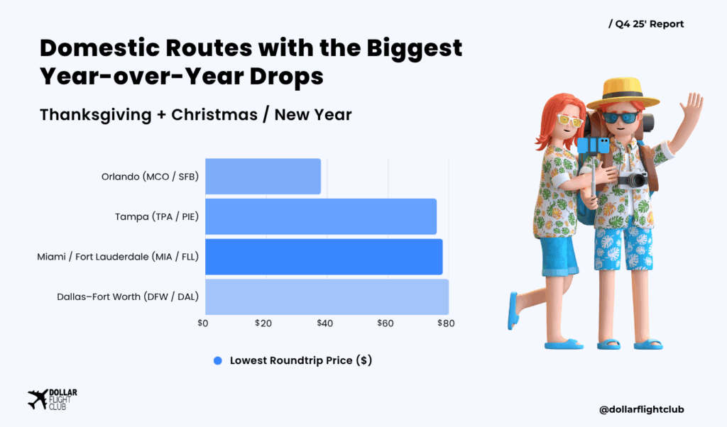 - Why it’s down: Two major airports (MIA + FLL) competing head-to-head, plus added seasonal airline capacity.