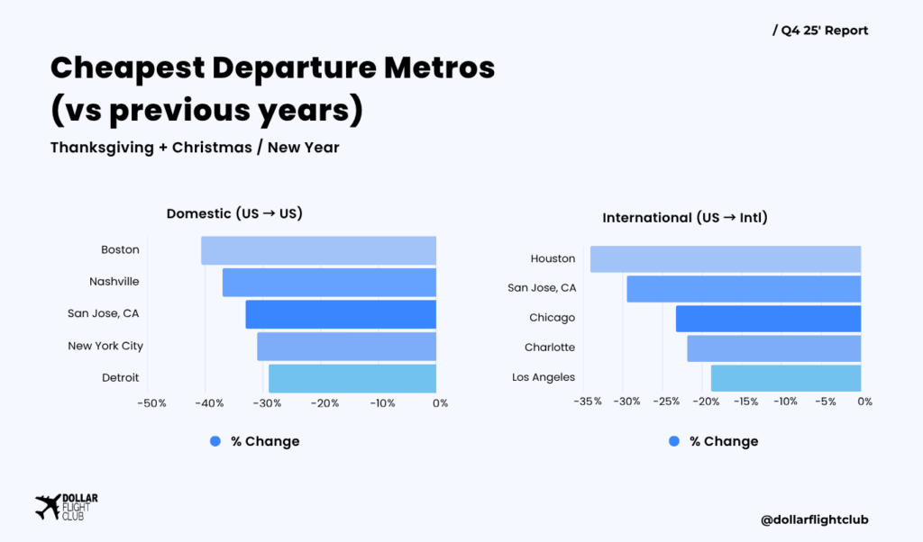 6. Cheapest Departure Metros (vs previous years; Thanksgiving + Xmas/NY)